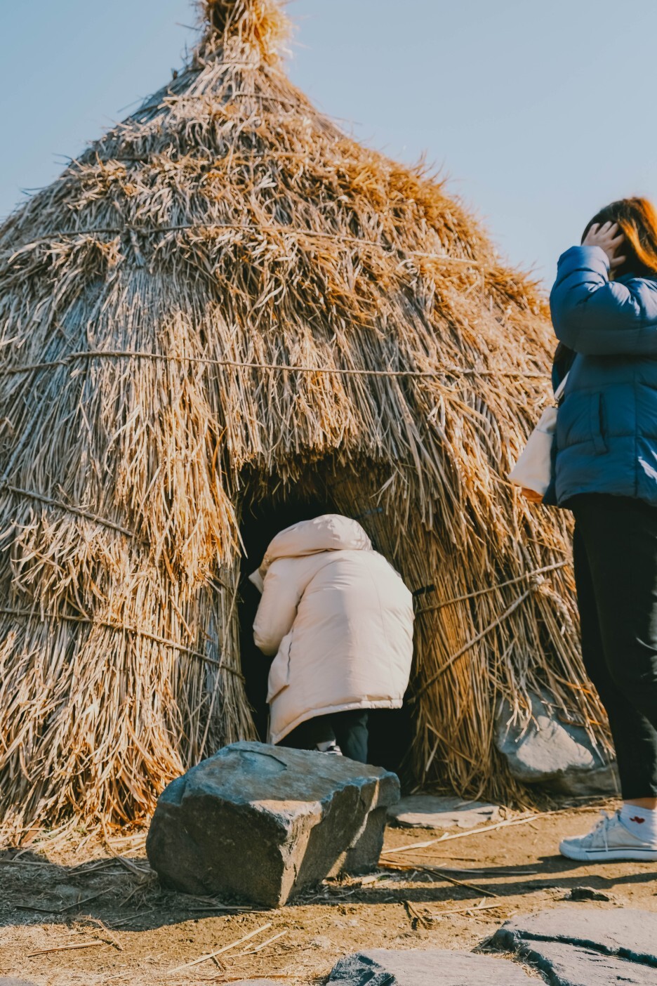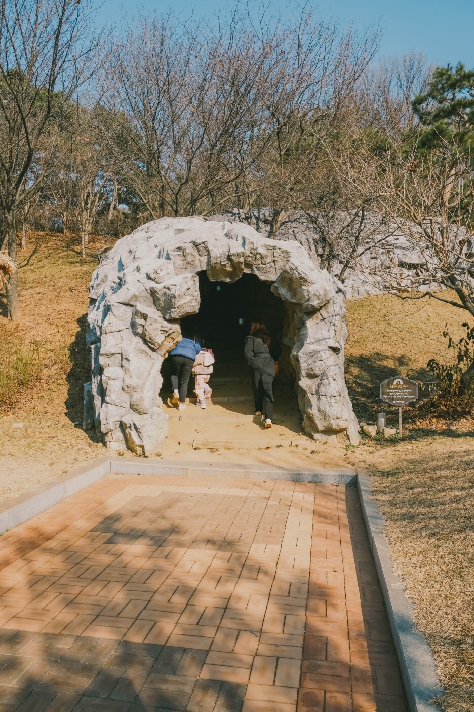 입구에는 막집과 원시인 모형이 있는데 아이들은 벌써부터 궁금 했던 것인지, 빠르게 막집 속으로 빠져들어 갔다.