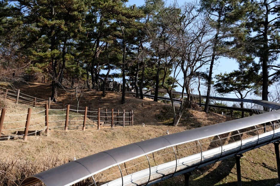 뒷 산을 이용한 체험 숲(?)은 아이들을 매료시키기 충분 한듯 하다. 동굴을 통과해 숲을 지나 미끄럼틀로 이어지는