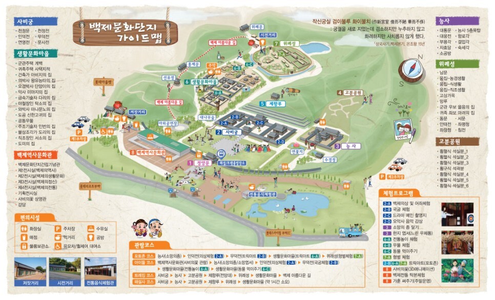 백제문화단지는 사비성,능사,생활문화마을,위례성 4구격으로 나눠진다.
